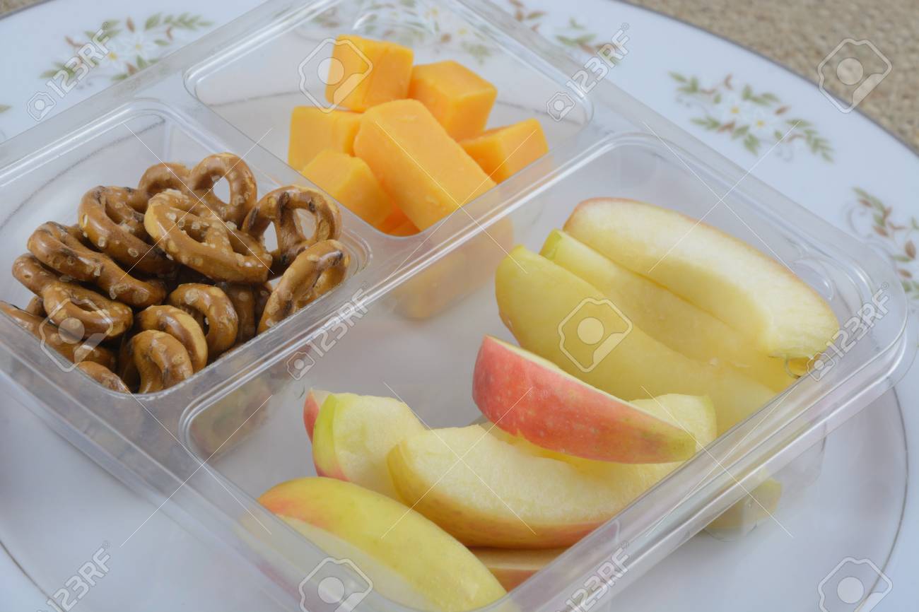 Healthy Snack Of Sliced Apples Cheddar Cheese Cubes And Pretzels