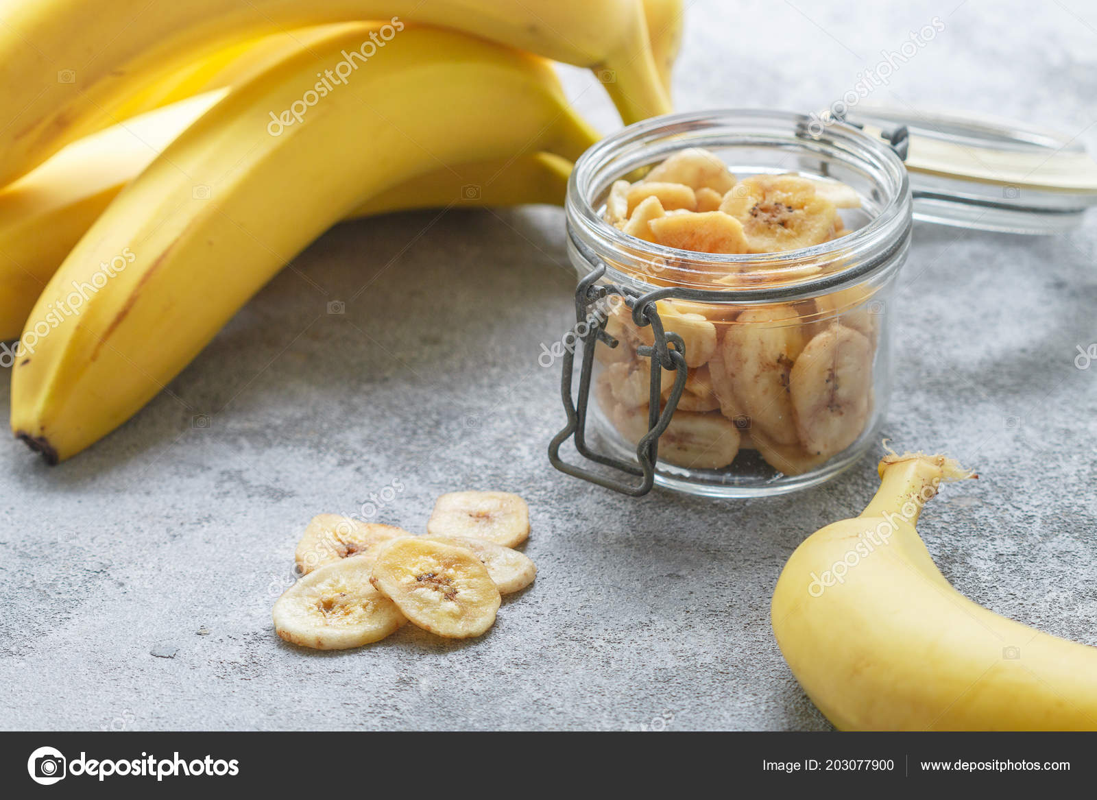 Homemade Dried Banana Chips Glass Jar Fresh Bananas Yellow