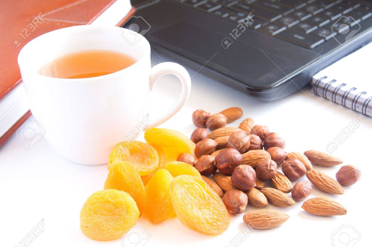 Healthy Quick Snack Lunch In Office Cup Of Tea Dry Apricots
