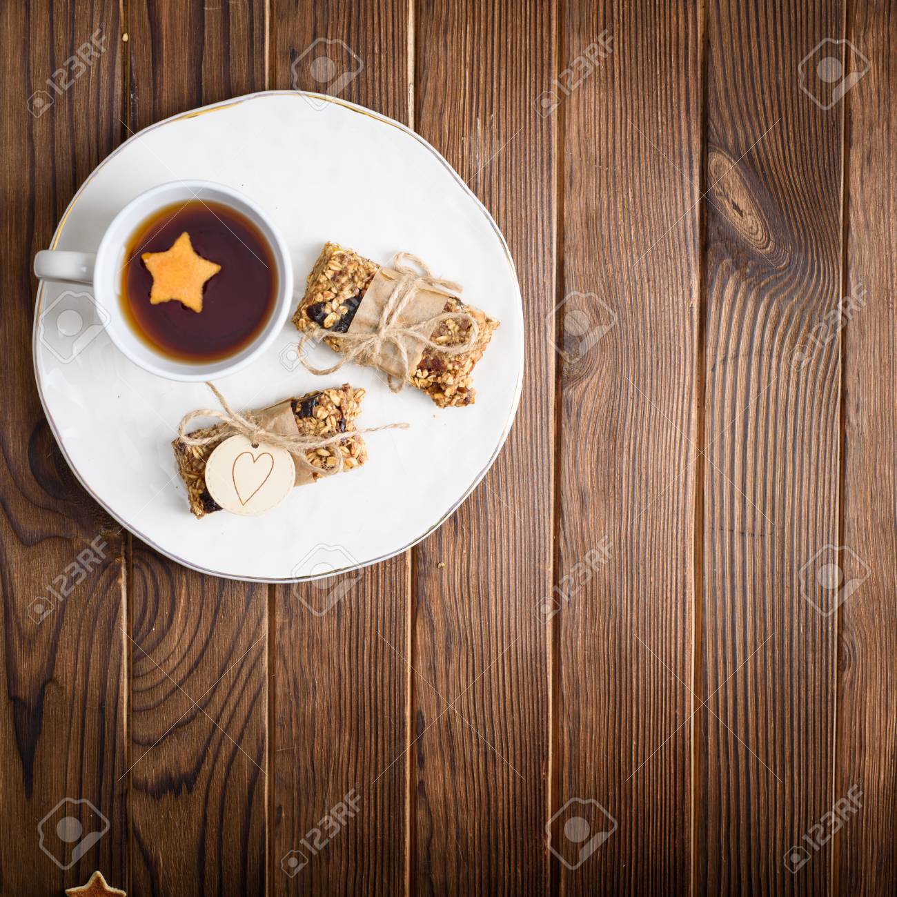 Homemade Granola Oatmeal Energy Bars And Cup Of Tea On White Plate Healthy Snack Copy Space On Wood Desk
